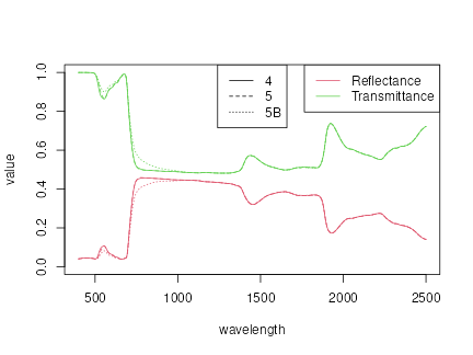 legend("topright", c("Reflectance", "Transmittance"), col=c(2, 3), lty = 1)