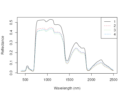matplot(p4s, xlab="Wavelength (nm)", ylab="Reflectance")